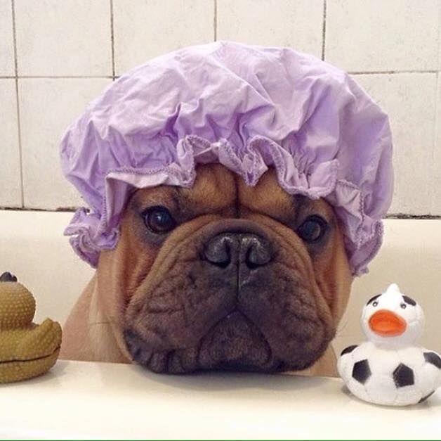 I wish our puppies took bath time so calmly. For as many dogs as we have, we have that many responses to the activity. I wish I could post pictures of my dogs in the tub posed as this Frenchie, but it won’t happen.